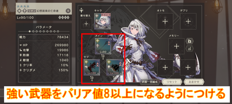 あとは強力なウェポンスキルを持つ武器をメイン武器に、属性強化持ちの武器があれば優先的にサブ武器に装備するだけです。基本的には適当に組んで問題ないですが、バリアの値の合計が6だと若干不安があるので、8以上にはしておきたいところです。