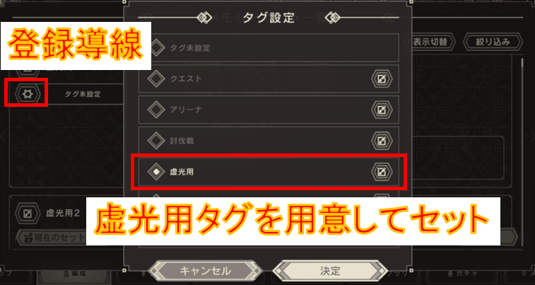 すでにメモリーセット1~3の枠が埋まっていて、その枠を動かしたくない方は、虚光クエ用のタグを設定しておくとよいでしょう。