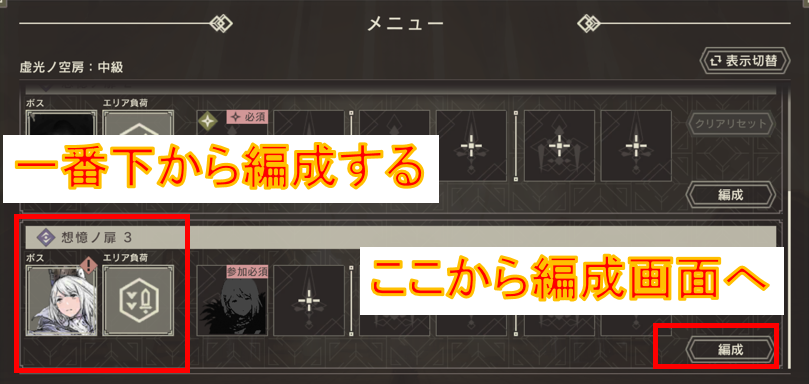 各エリア最後のクエスト(虚光コスチュームに挑むバトル)は難易度が少し高いので、最後のクエストに強いキャラを優先してアサインするため、先に編成を済ませておくと、エリア全体でバランスの良い編成をしやすいです。また、編成をする際は、右下の「編成」ボタンを使いましょう。メニュー画面ではキャラクターとメイン武器しか編成できず、決定するたびにメニュー画面に戻されてしまうので非常に不便です。