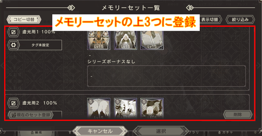 すでにメモリーセット1~3の枠が埋まっていて、その枠を動かしたくない方は、虚光クエ用のタグを設定しておくとよいでしょう。