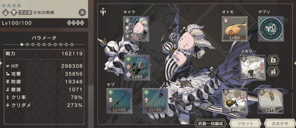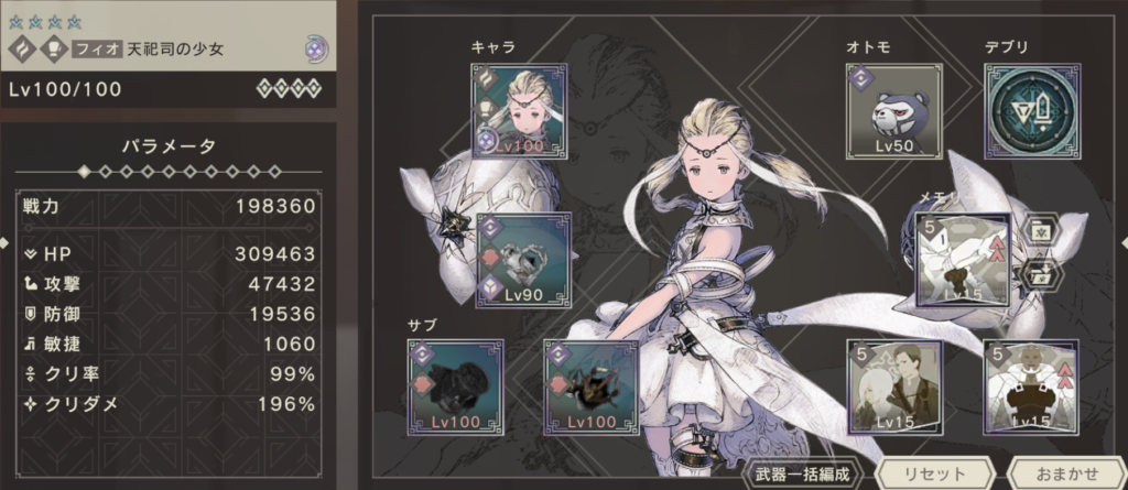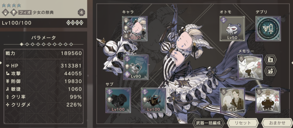 天祀司フィオと祭典フィオを比較すると、天祀司フィオのほうが攻撃力は高いものの、祭典フィオの致命アビリティによってクリダメ補正がかかったり、キャラスキルのヒット数が祭典フィオのほうが多かったりと、強さの差がわかりにくくなっています。具体的に編成を組んで比較してみましょう。
