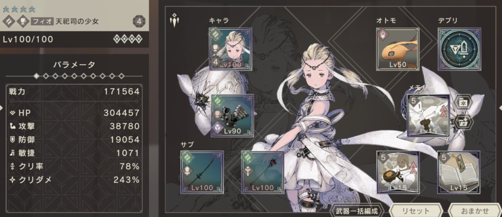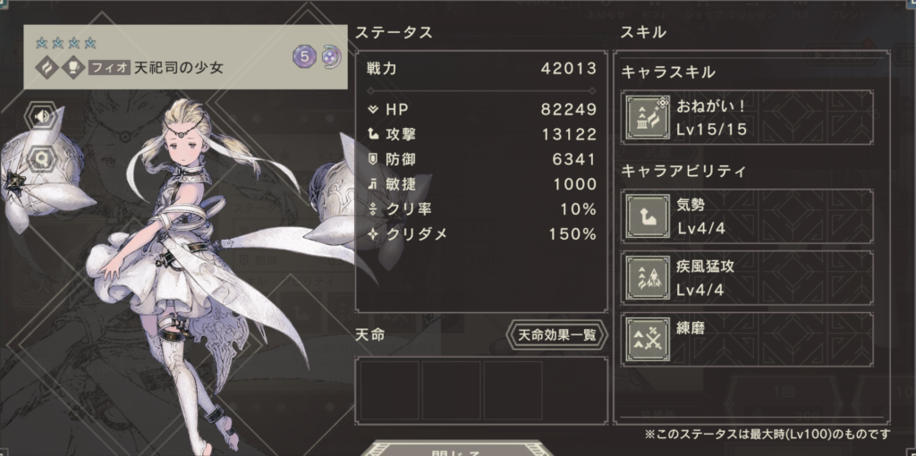 天祀司フィオは、攻撃型のステータス配分をされたアタッカーです。3覚醒時に練磨アビリティが開放されることから、得意武器で攻撃することで真価を発揮するでしょう。メイン武器の属性が風属性でない場合は、疾風猛攻アビリティがはたらきませんが、本人のステータスが高いので、メイン武器の属性が風属性でなくてもある程度のパフォーマンスが期待できます