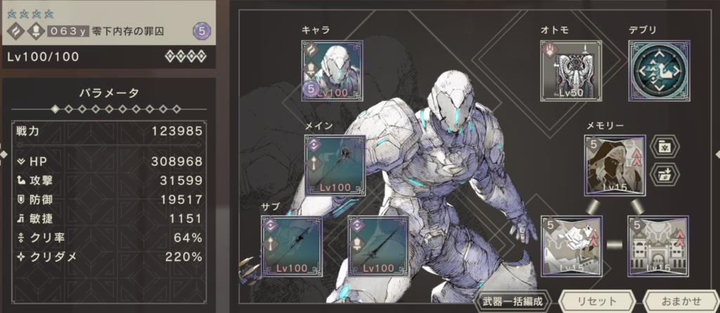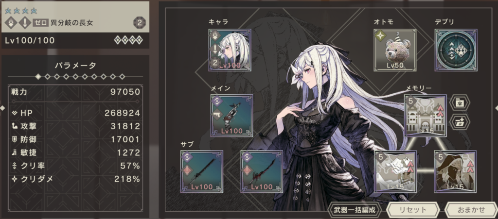 デブリは、先攻20%のものを採用し、CSを即時2巡できるように。サブ武器に虚光リオンの杖を採用する形でもよいのですが、ゼロの火力が足りなかったためこちらの形にしています。