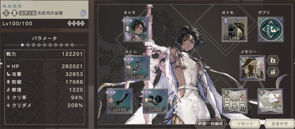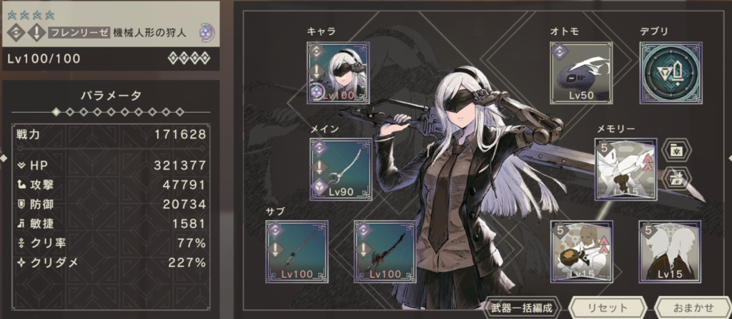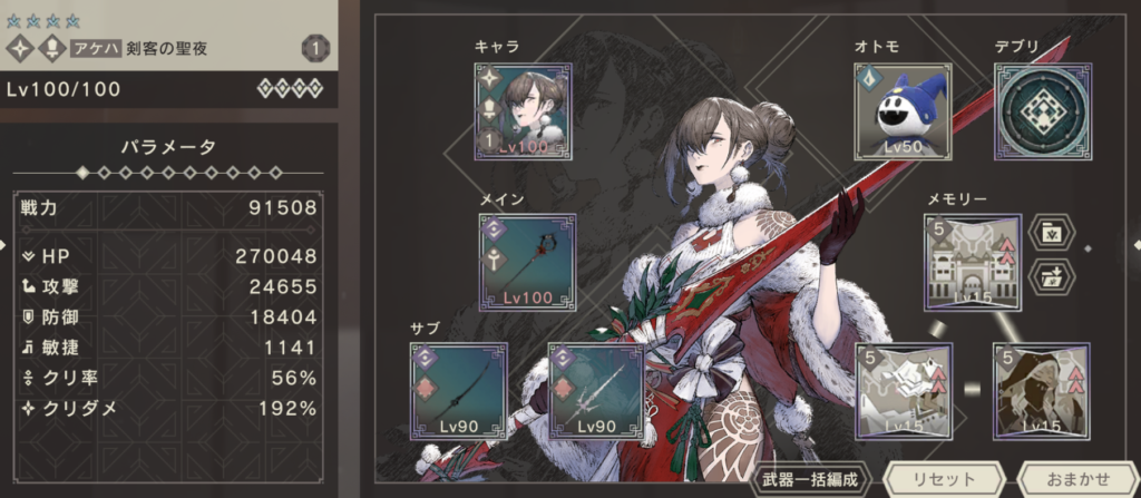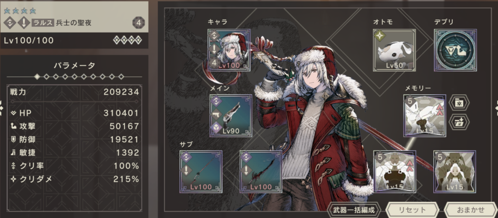 サブ武器は、もっともダメージを出せる組み合わせを選択。聖夜プリエの拳が余っていれば、クリ率を100%に近づけるために採用したかったです。