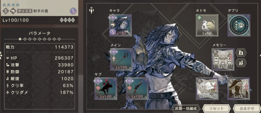 サブ武器は、攻撃力を最も上げられる組み合わせを選択。ノックダウンゲージをためるぎりぎりのスキル回しをしているので、可能な限り火力を上げています(ゼロが天命流転しているのであればあまりこだわらなくてもよさそうです)。